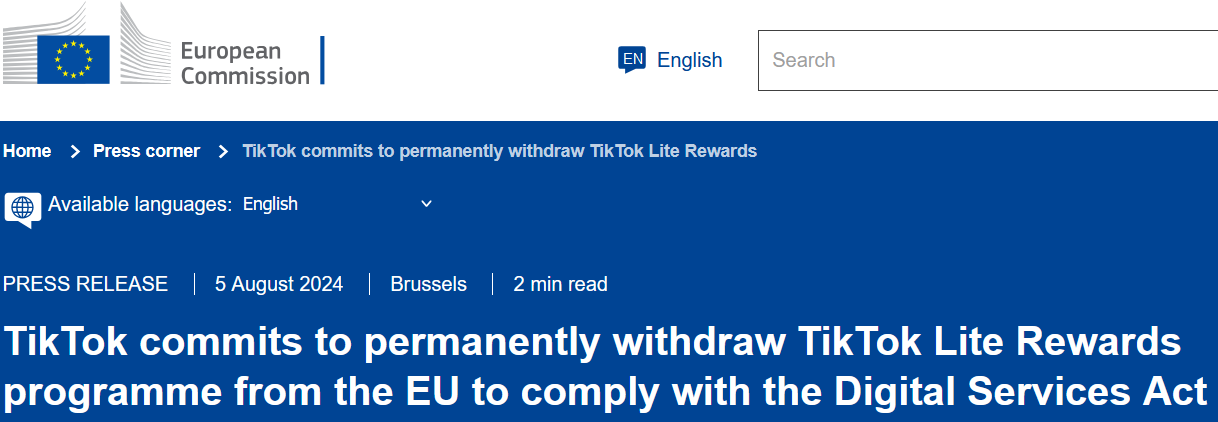 У той же час компанія зобов'язалася закрити TikTok Lite на ринку ЄС, а також не намагатися обійти свої зобов'язання, наприклад, запровадити ту саму функцію під іншою назвою або розгорнути нову версію.