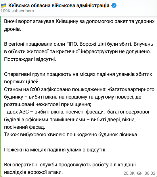 У Київській області уламками від нічної атаки РФ пошкоджено багатоповерхівку, дві АЗС, багатоповерхову будівлю з офісами та будинок лісника.