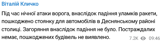 Також у Києві вночі було падіння уламків збитої ракети. Про це повідомив мер міста Віталій Кличко.