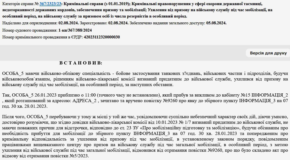 Згідно з вироком суду, чоловік відмовився отримати повістку і не з'явився до ТЦК.