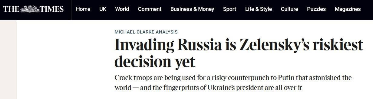 У публікації йдеться, що Зеленський протягом кількох місяців у повній таємниці тиснув на військове керівництво, щоб розпочати наступ. Повідомляється, що Україна атакувала б Росію, навіть якби не отримала дозволу від Заходу. Таким чином, Київ хоче змінити наратив про те, що "Україна програє війну".