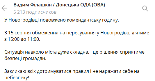 За його словами, комендантська година в цьому місті діятиме 20 годин на добу: з 15:00 до 11:00. Такі правила набудуть чинності із завтрашнього дня, 15 серпня.