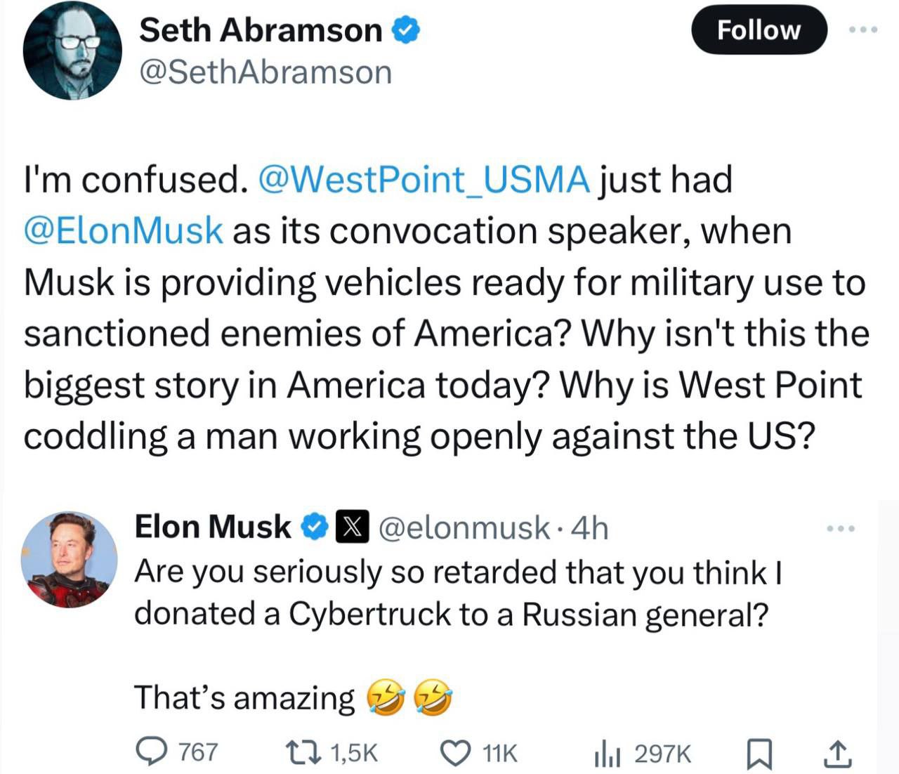 "Я збитий с пантелику. Щойно Ілон Маск був спікером зборів у Військовій академії США Вест-Пойнт, у той час як надає транспортні засоби, готові до використання у військових цілях, офіційним ворогам Америки? Чому Вест-Пойнт няньчиться з людиною, яка відкрито працює проти США?" - сказано у публікації Абрамсона.