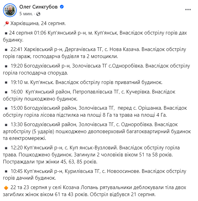 08:45 Минулої доби росіяни обстрілювали населені пункти Куп'янського та Богодухівського району Харківської області.