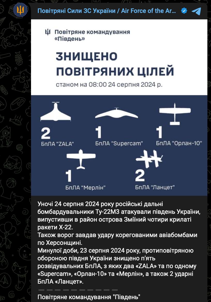 Було випущено чотири крилаті ракети Х-22 з бомбардувальників Ту-22М3. Про збитки цілей ЗСУ не повідомляли.