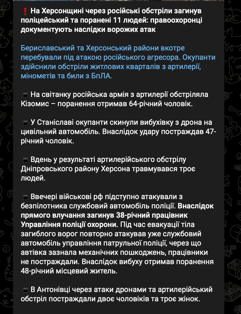 11:20 На Херсонщині дрон вразив поліцейську машину, загинув 38-річний правоохоронець, повідомляє Нацполіція.