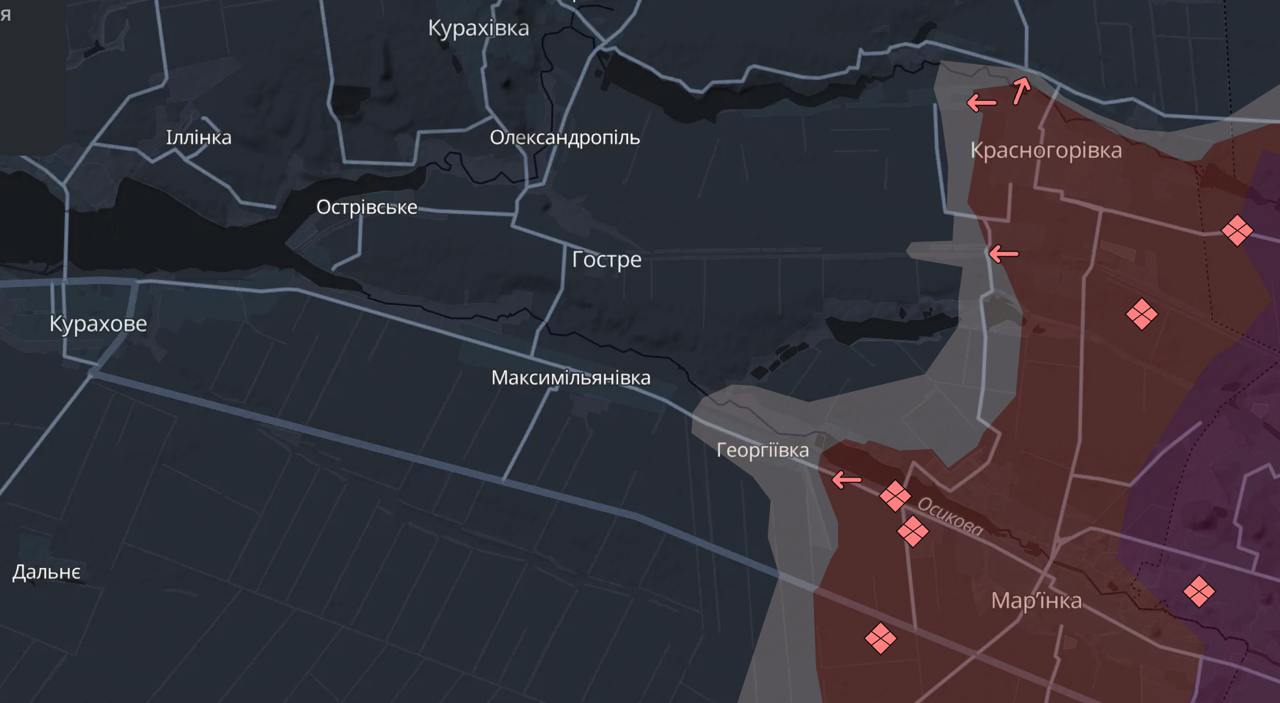 У районі Красногорівки росіяни пішли на штурм на захід від міста та висадили десант із бронетехніки. На ділянці йдуть бої, повідомив Deep State (змін на карті на цій ділянці паблік не фіксує).