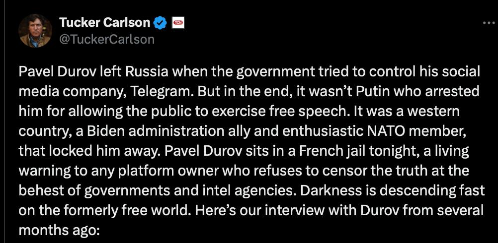 "Павло Дуров залишив Росію, коли уряд спробував взяти під контроль його соціальну мережу Telegram. Але зрештою, це не Путін заарештував його за те, що він дозволив громадськості здійснювати свободу слова. Це західна країна, союзник адміністрації Байдена та активний член НАТО, замкнула його. Павло Дуров сьогодні сидить у французькій в'язниці, живе попередження будь-якому власнику платформи, який відмовляється цензурувати правду за наказом урядів та розвідувальних служб. Темрява швидко опускається на вільний світ", - написав Карлсон у Х.
