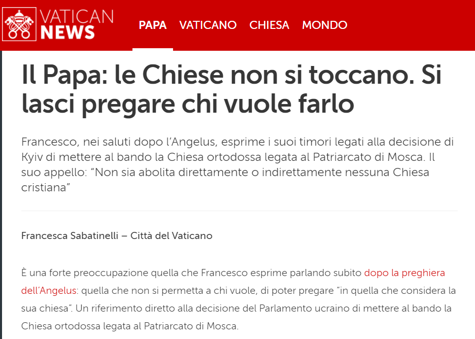 Папа Римський Франциск коментуючи український закон, який уможливлює заборону Української православної церкви (УПЦ МП) в Україні, закликав "не забороняти жодну християнську церкву прямо чи опосередковано".