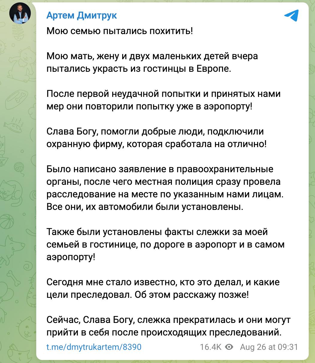 "Мою сім'ю намагалися викрасти! Мою матір, дружину та двох маленьких дітей вчора намагалися вкрасти з готелю в Європі. Після першої невдалої спроби та вжитих нами заходів вони повторили спробу вже в аеропорту! Слава Богу, допомогли добрі люди, підключили охоронну фірму, яка спрацювала на чудово!" – розповів Дмитрук.