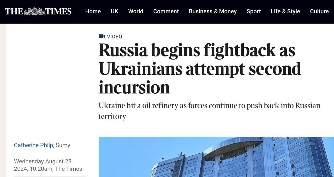 Тим часом західна преса вже заговорила про невдачу Курської операції. Так, у Financial Times вийшла стаття з критикою президента України Володимира Зеленського через рішення відправити війська наступати під Курськом, а не обороняти Покровськ.