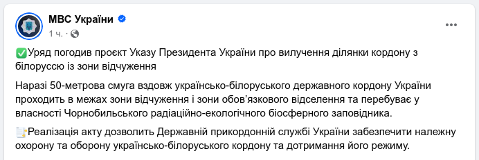 "Реалізація акту дозволить Державній прикордонній службі України забезпечити належну охорону та оборону українсько-білоруського кордону та дотримання його режиму", – йдеться у повідомленні відомства.