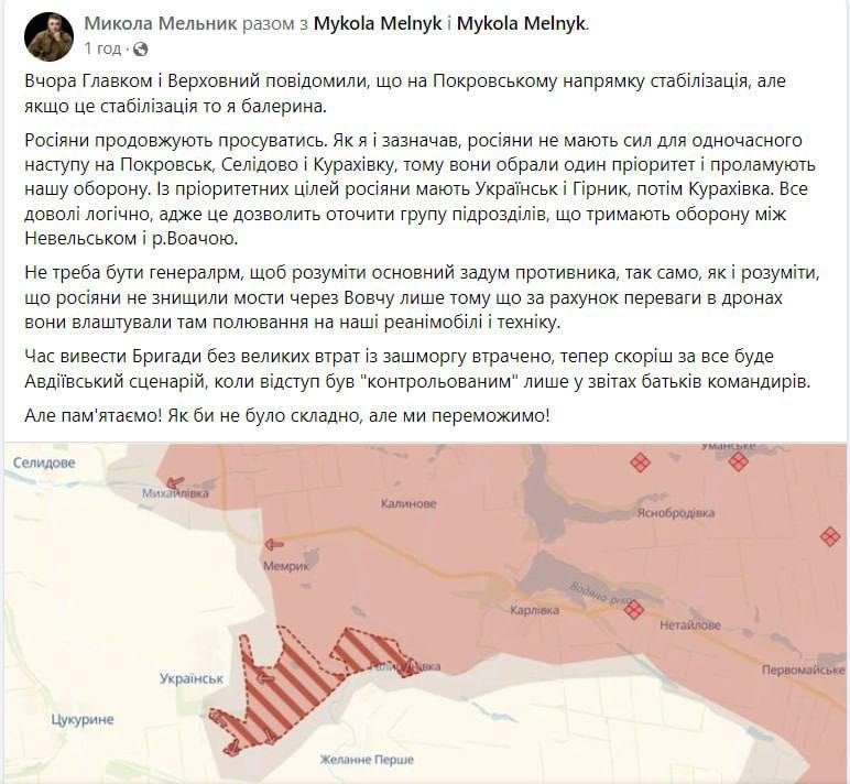 Офіцер ВСУ, командир роти 47-й ОМБр Микола Мельник спростував заяви Володимира Зеленського та Олександра Сирського про стабілізацію ситуації під Покровськом та заявив про загрозу оточення ВСУ.