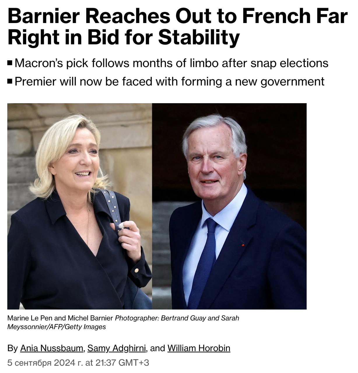 У своєму виступі після призначення Мішель Барньє "пообіцяв зосередитись на питаннях, важливих для вкрай правих, таких як безпека та скорочення міграції, на знак поваги до головних пріоритетів "Національного об'єднання" Марін Ле Пен, хоча він і не назвав її імені", йдеться в статті.