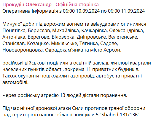 08:05 Під час нічної атаки РФ Сили протиповітряної оборони знищили п'ять "Шахедів" на Херсонщині. Про це повідомляє голова ОВА Олександр Покудін.