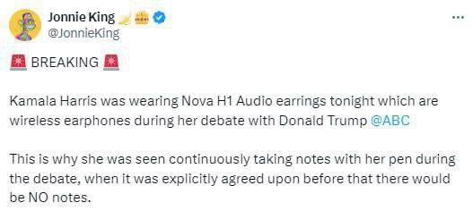 Також у мережі з'явилася версія, що Харріс була в навушниках на дебатах із Трампом. Зокрема про це написав музикант Джонні Кінг.