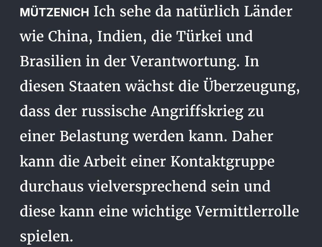 "Федеральний канцлер і президент України Володимир Зеленський згодні з тим, що зараз слушний момент для активізації зусиль щодо проведення мирних переговорів, і що на наступному мирному саміті Росія також має бути присутньою. Я це однозначно вітаю. Це також дає іншим країнам можливість активніше брати участь у припиненні бойових дій. На мій погляд, настав час для західних союзників ініціювати контактну групу, щоби запустити цей процес", - сказав Мютцених.