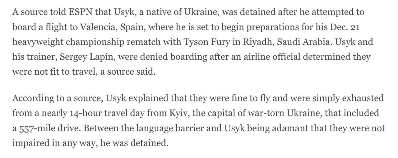 "Через мовний бар'єр і непохитну позицію Усика, що вони в порядку, він був затриманий", - пише ESPN.