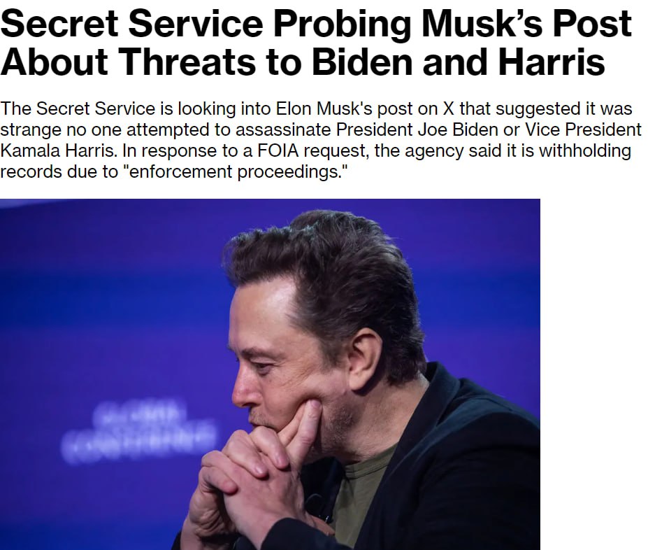 Секретна служба США зайнялася американським бізнесменом Ілоном Маском, побачивши в посту власника соцмережі X загрозу голові Білого дому Джо Байдену та віце-президенту Камалі Харріс.