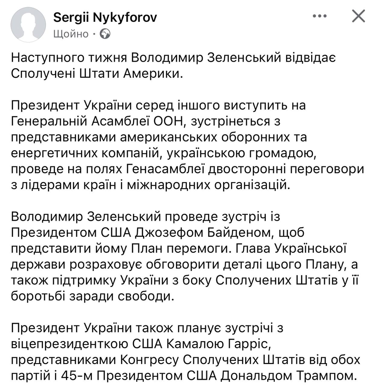 Також, за словами Никифорова, Зеленський зустрінеться з віце-президентом США Камалою Харріс та Дональдом Трампом.