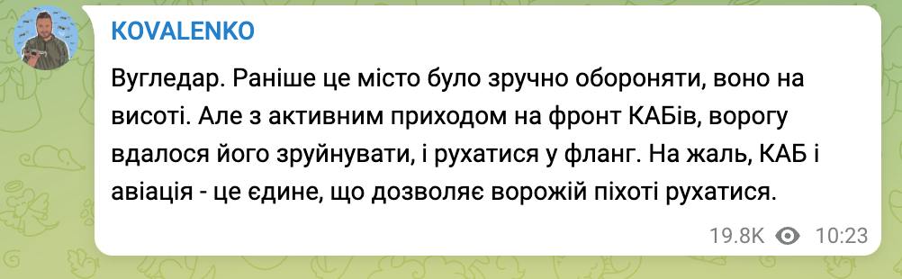 "Раніше це місто було зручно обороняти, воно на висоті. Але з активним приходом на фронт КАБів ворогові вдалося його зруйнувати і рухатися у фланг. На жаль, КАБ і авіація - це єдине, що дозволяє ворожій піхоті рухатися", - пише Коваленко.