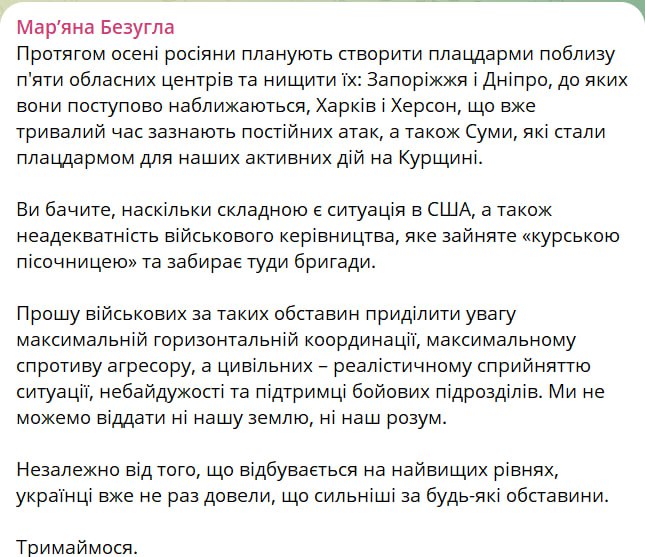 «Протягом осені росіяни планують створити плацдарми поблизу п'яти обласних центрів та знищувати їх: Запоріжжя та Дніпро, до яких вони поступово наближаються, Харків та Херсон, які вже тривалий час зазнають постійних атак, а також Суми, які стали плацдармом для наших активних дій у Курській області », - Написала вона.