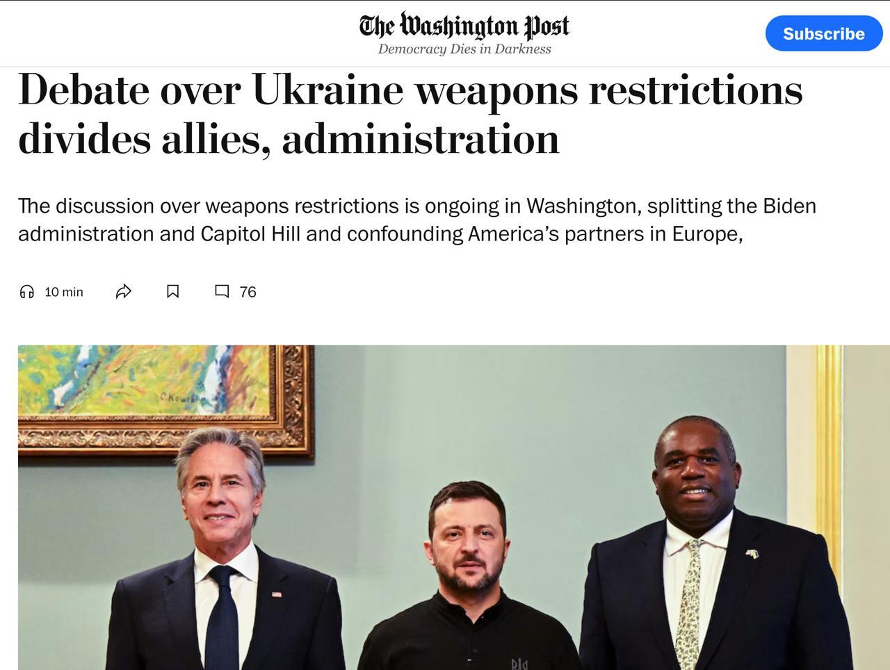 "Навіть після того, як міністр оборони США Ллойд Остін ясно дав зрозуміти, що категорично проти послаблення правил завдання ударів ракетами ATACMS, державний секретар Ентоні Блінкен під час візиту до Києва заявив, що відкритий для українських аргументів і передасть їх Байдену для ширшого обговорення в Вашингтоні. За словами офіційних осіб, ця дискусія продовжується", - пише видання.