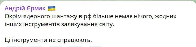 "Крім ядерного шантажу в Росії більше немає нічого, жодних інших інструментів залякування світу. Ці інструменти не спрацюють", - написав Єрмак.