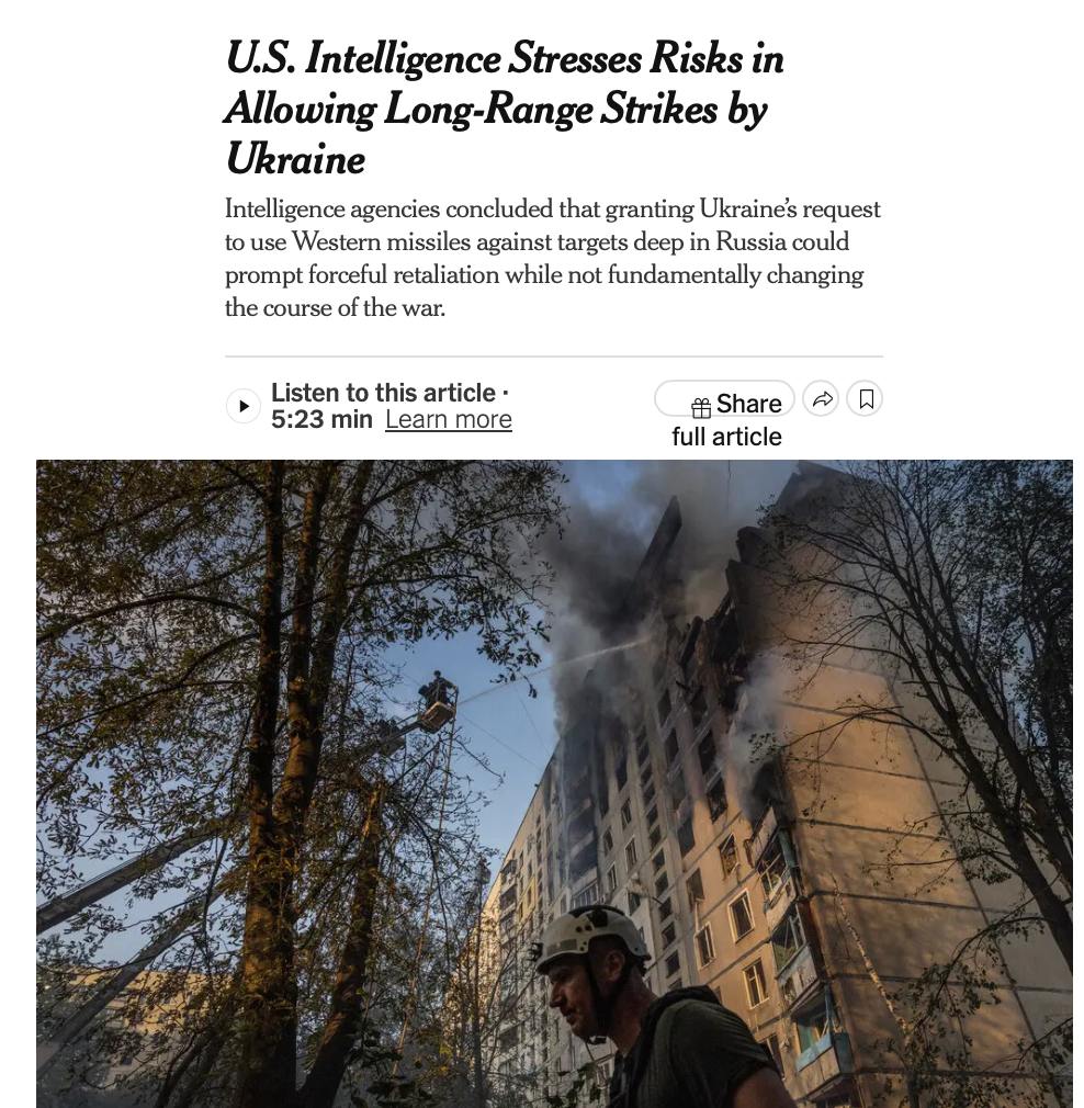 Розвідка США дійшла висновку, що дозвіл Україні використовувати західні ракети по цілях в глибині Росії може спровокувати "жорстку відповідь" Росії, але "не змінить принципово хід війни".