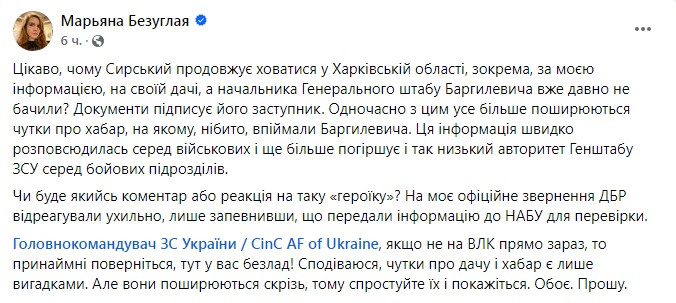 "Цікаво, чому Сирський продовжує ховатися в Харківській області, зокрема, за моєю інформацією, на своїй дачі, а начальника Генерального штабу Баргилевича вже давно не бачили? Документи підписує його заступник. Водночас дедалі більше поширюються чутки про хабарі, на яких нібито упіймали Баргілевича. Ця інформація швидко поширилася серед військових і ще більше посилює і так низький авторитет Генштабу ЗСУ серед бойових підрозділів", - сказано у дописі Безуглої.