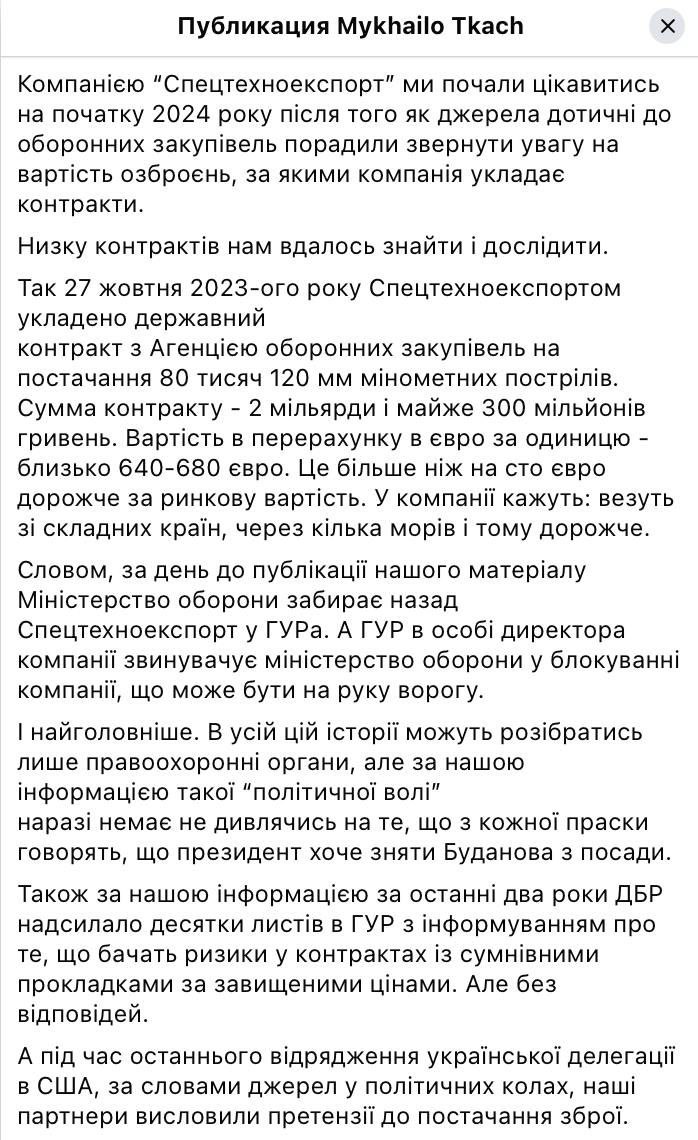 На початку серпня Міноборони України розпочав аудит “Спецтехноекспорта” через накопичені борги. При цьому, стверджує Ткач, представники ГУР чинили перешкоди аудиту, відмовляючись видавати документи та відкривати доступ до закритих систем.