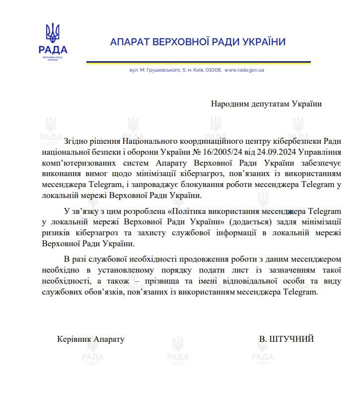 "Думаю, що такі заходи безпеки є цілком логічними. На жаль, вже були приклади, коли сторонні отримували дані держпрацівників через Телеграм, яким користувалися на робочих пристроях. Цим приписом ми мінімізуємо ризики. Підкреслю, що це стосується працівників Апарату Ради і не обмежує використання месенджера в особистих цілях", - зазначив нардеп.