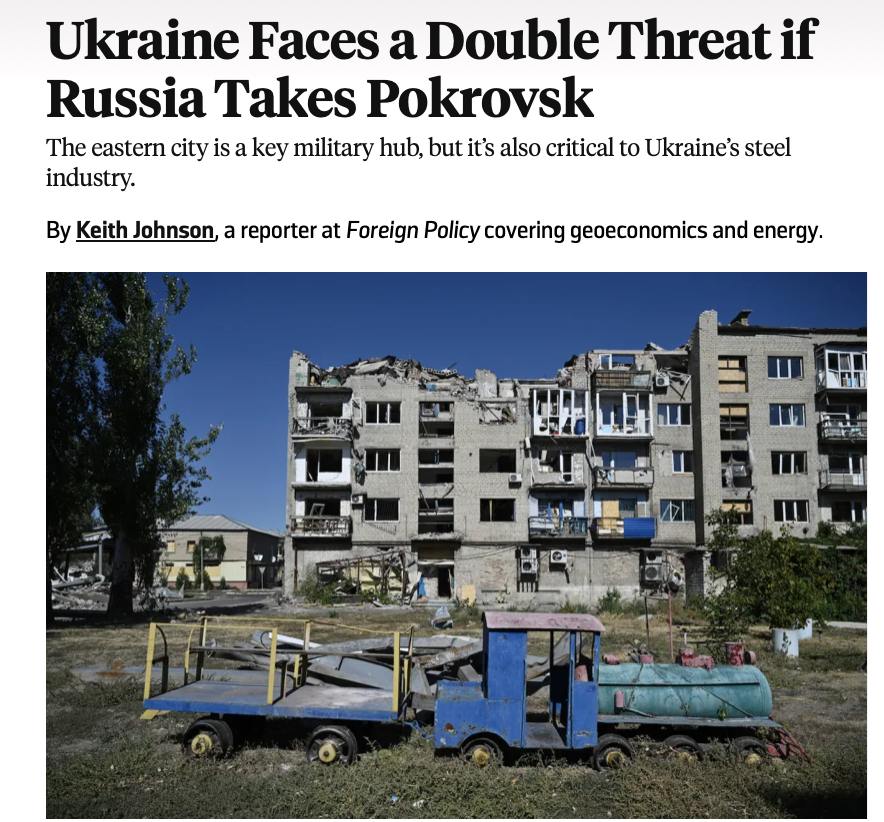 Втрата Покровська Донецької області може стати критичним ударом по українській сталеливарній промисловості. У місті видобувають більшу частину вугілля, що використовується для сталеливарної та чавуноливарної промисловості країни.
