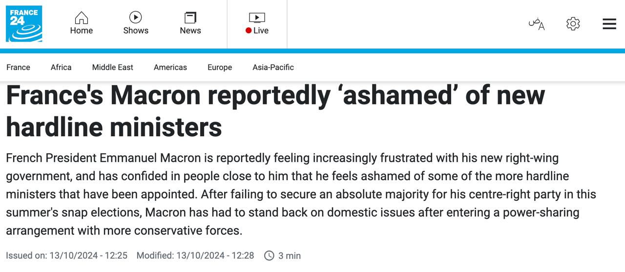 Президенту Франції Еммануелю Макрону "соромно", що новий уряд Франції, який він сам же і "породив" після виборів, "кинувши" лівий "Новий народний фронт", що переміг на них, вийшов занадто "правим".