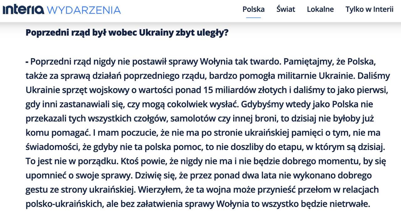 Він також знову порушив тему Волинської різанини та звинуватив Україну в тому, що за два роки вона не зробила "жодного доброго жесту" в цьому напрямку, а зараз Київ, на його думку, недостатньо цінує допомогу Варшави.