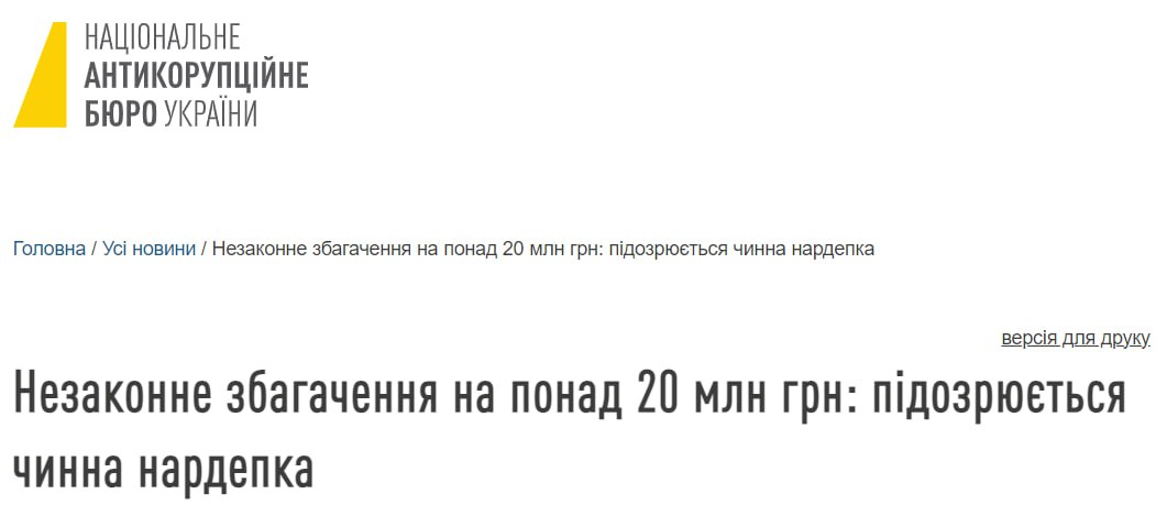 Національне антикорупційне бюро України (НАБУ) та Спеціалізована антикорупційна прокуратура (САП) повідомили про підозру у незаконному збагаченні на понад 20 мільйонів гривень чинному народному депутату.