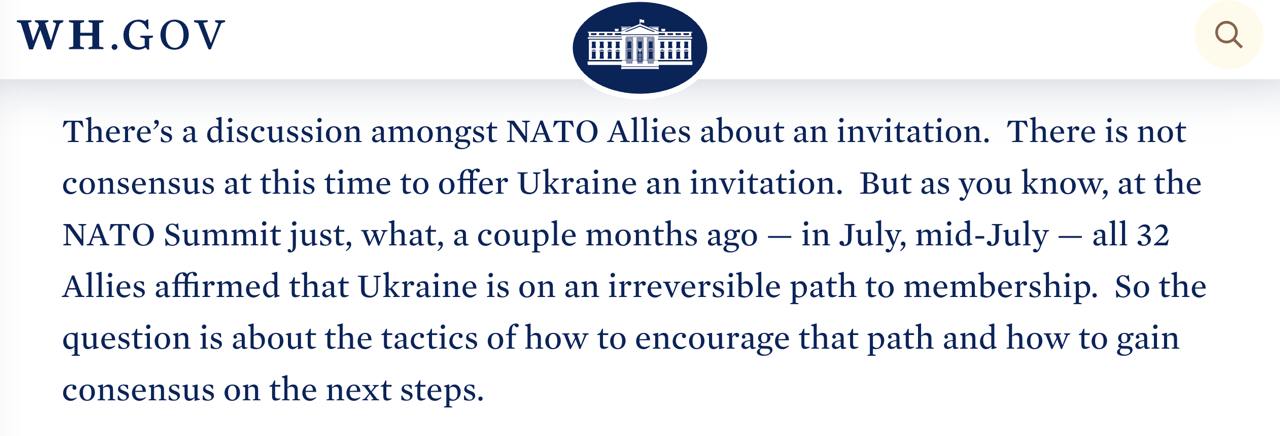 "Серед союзників щодо НАТО йде дискусія про запрошення. Наразі немає консенсусу щодо того, щоб запропонувати Україні запрошення. Але, як ви знаєте, на саміті НАТО в середині липня всі 32 союзники підтвердили, що Україна перебуває на незворотному шляху до членства. Тому питання у тактиці того, як заохочувати цей шлях і як досягти консенсусу щодо наступних кроків", - заявив на брифінгу представник адміністрації Джо Байдена. Його слова наводить сайт Білого дому.