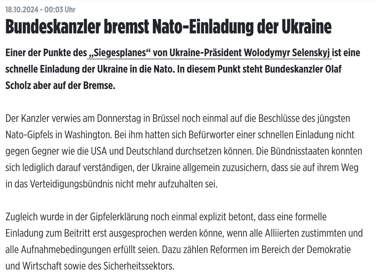 Виступаючи у Брюсселі, канцлер заявив, що блокуватиме швидке запрошення України до НАТО. Він послався на недавній саміт у Вашингтоні, на якому не було досягнуто консенсусу з цього питання: проти виступали США та ФРН.