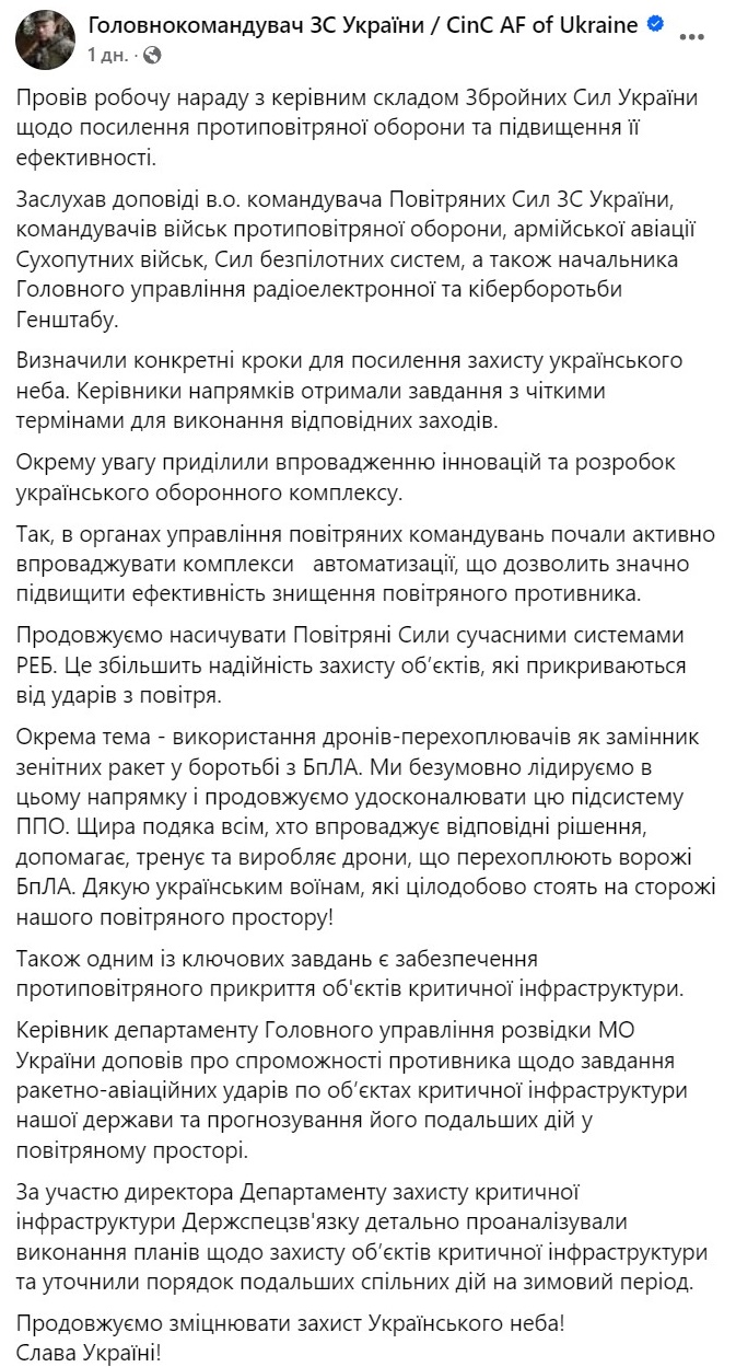 Також він зазначив, що одним із ключових завдань є забезпечення протиповітряного прикриття об'єктів критичної інфраструктури.