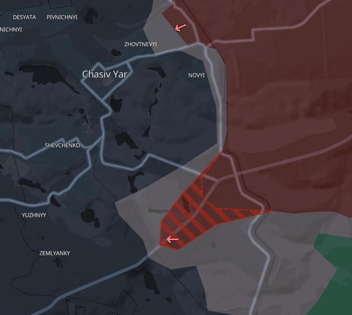 На південь, на Донеччині, росіяни просунулися на південь від Часового Яру трасою Бахмут-Костянтинівка. Про це раніше писали російські пабліки. Такий поступ створює загрозу початку штурму міста з південного флангу (зараз наступ йде зі сходу).