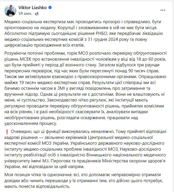 Звільнено голову Центральної медико-соціальної експертної комісії (МСЕК) та низку інших чиновників Міністерства охорони здоров'я (МОЗ), відповідальних за скандал із липовими інвалідностями.