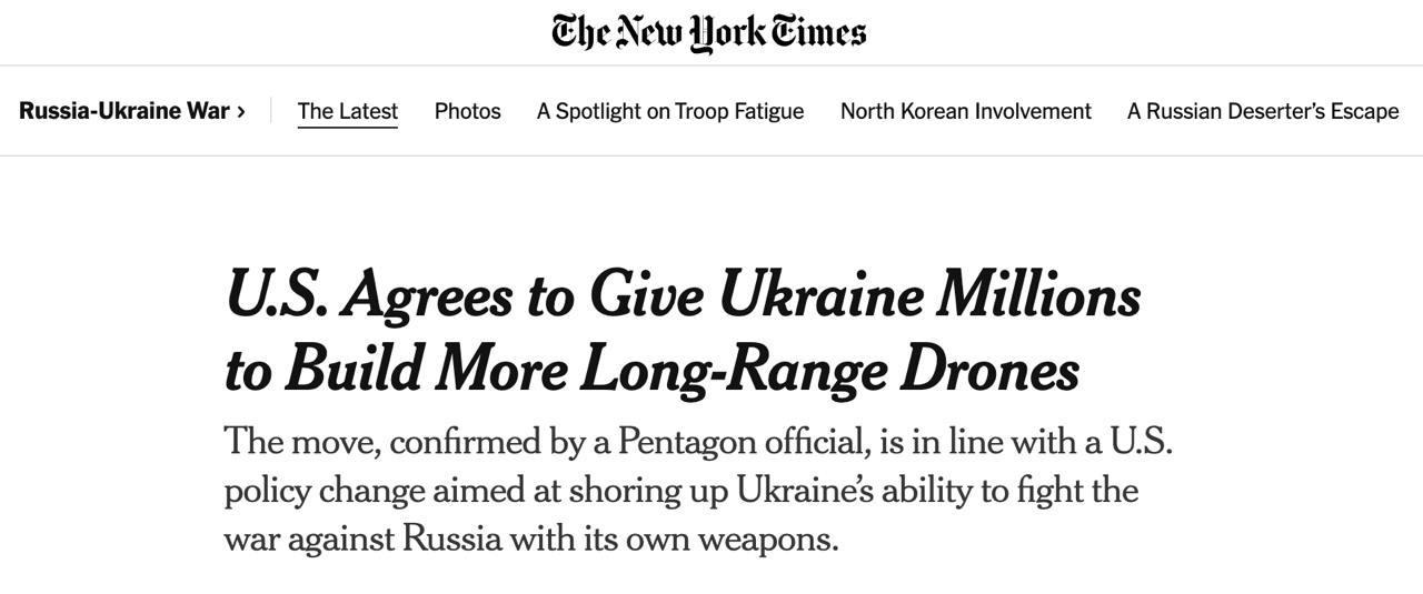 З початку російського вторгнення США надали Україні понад 61 мільярда доларів як допомогу у сфері безпеки, але відмовлялися давати гроші на зброю Україні безпосередньо, "натомість представляючи свою допомогу Києву у війні як спосіб підтримати американські компанії і мінімізувати потенційну корупцію". Але останнім часом допомога Україні зменшилася, частково через побоювання щодо скорочення запасів Пентагону. А західні чиновники почали хвалити українські удари далекобійними дронами по російських об'єктах, внаслідок яких за кілька днів було знищено близько 100 тисяч тонн боєприпасів.