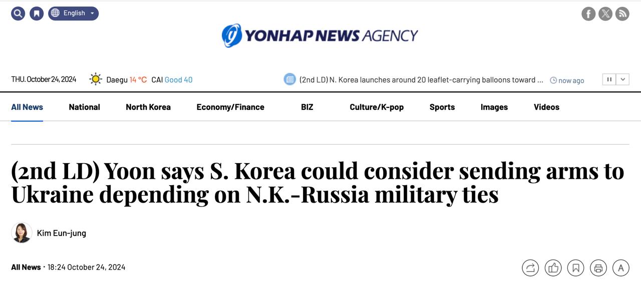 Президент Південної Кореї Юн Сок Йоль заявив про можливість постачання зброї ЗСУ, якщо військові з КНДР вирушать на війну в Україні.