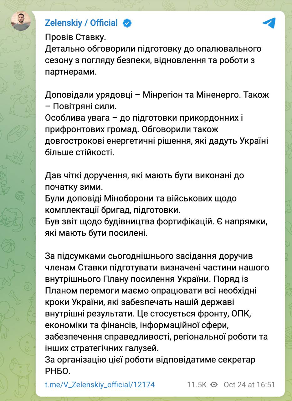 Ставку було присвячено підготовці до опалювального сезону. Як написав президент, новий план має забезпечити Україні "внутрішні результати", що стосуються "фронту, ОПК, економіки та фінансів, інформаційної сфери, забезпечення справедливості, регіональної роботи та інших стратегічних галузей".