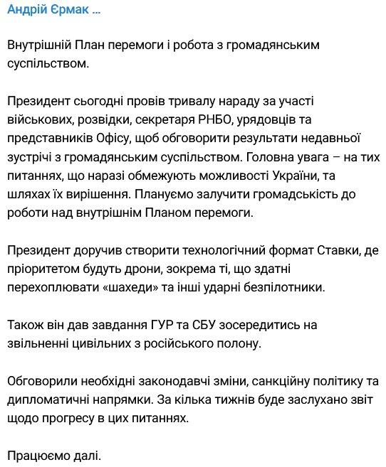 Про це заявив голова Офісу президента Андрій Єрмак за підсумками наради Зеленського із військовими.