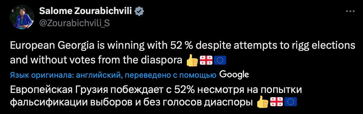 "Європейська Грузія перемагає з 52%, незважаючи на спроби фальсифікації виборів і без голосів діаспори", - заявила вона.