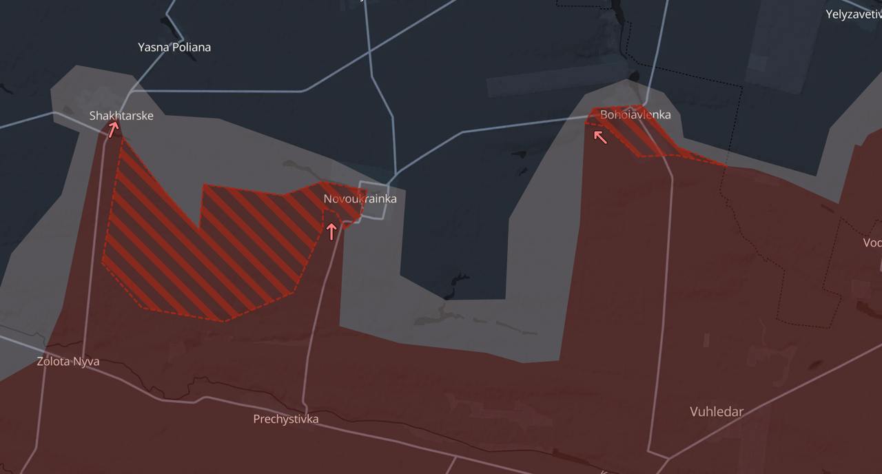 Також DS підтвердив захоплення майже всієї Богоявленки (на північ від Вугледару). Невелика частина села, за версією пабліка, знаходиться у сірій зоні.