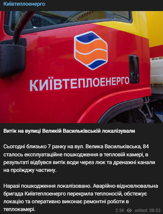"Сьогодні близько 7 ранку по вул. Велика Васильківська, 84 сталося експлуатаційне пошкодження в тепловій камері, в результаті стався витік води через люк та дренажні канали на проїжджу частину", - йдеться у повідомленні.