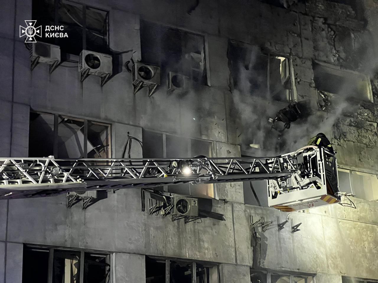"В результаті атаки ударних дронів ЗС РФ у Києві зафіксовано падіння уламків у Солом'янському районі. У багатоповерховому житловому будинку виникла пожежа в кількох приміщеннях. З будинку було евакуйовано 18 осіб. Постраждали дев'ять осіб, серед яких одна дитина", - йдеться у повідомленні.