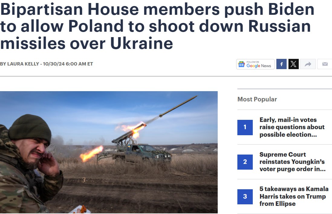 Видання повідомляє, що лідери Гельсінської комісії Конгресу США від обох партій закликають президента Байдена дозволити союзнику по НАТО Польщі поширити свою протиповітряну оборону на небо України, допомагаючи збивати російські ракети під приводом самооборони.